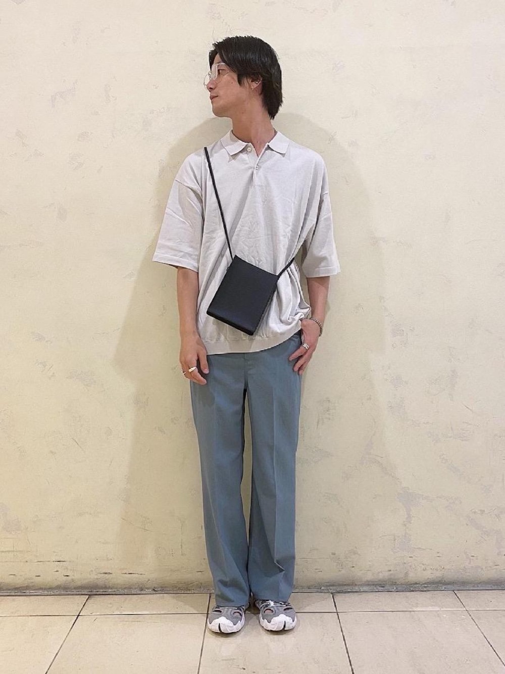●年齢:30代前半 ●身長:176cm ●普段サイズ:トップスL/ボトムスM/シューズ27cm 【サイズ感】 トップス:ややゆったり ボトムス:ジャストシルエット 【素材感】 トップス:上質感あるコットン100% ボトムス:ポリエステル100% ドライタッチの清涼感 【コーディネートポイント】 カラーパンツを用いたコーディネート。シンプルにグレーで組み合わせました。
