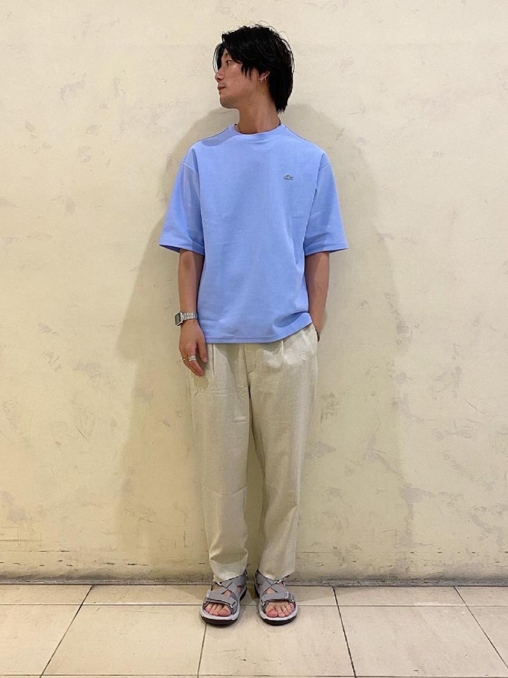 ●年齢:30代前半 ●身長:176cm ●普段サイズ:トップスL/ボトムスM 【サイズ感】 トップス:ややゆったり ボトムス:ややゆったり 【素材感】 トップス:綿60%・ポリエステル40%のニットライク ボトムス:ポリエステル82%・アセテート18% 【コーディネートポイント】 ボトムスですが、麻のような質感でドライタッチと上品な光沢感があるのでシンプルな服装の時でも大人っぽいコーディネートになります。