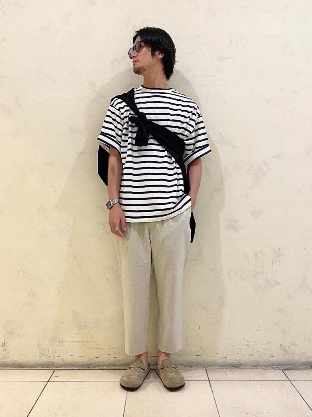 ●年齢:30代前半 ●身長:176cm ●普段サイズ:トップスL/ボトムスM 【サイズ感】 トップス:ワイドシルエット ボトムス:ゆったりシルエット 【素材感】 トップス:コットン100% ボトムス:ポリエステル82%・アセテート18% 【コーディネートポイント】 全体的にゆるっとしたコーディネートになってしまいシンプルに見え過ぎてしまうのを防ぐために、この季節の温度調整で使いやすいカーディガンを襷掛けにてファッションに取り入れました。 黒を入れることによってコーディネートが締まるように考えました。