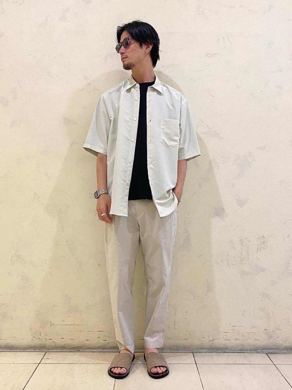 ●年齢:30代前半 ●身長:176cm ●普段サイズ:トップスL/ボトムスM 【サイズ感】 トップス:胸元にゆとりを持たせながらもテーパードシルエットなのでスッキリ ボトムス:ワイドテーパードシルエット 【素材感】 トップス:トリアセテート75%・ポリエステル25% ボトムス:シャリっと感のある生地感 【コーディネートポイント】 全体的にベージュ色でまとめながら、Tシャツに黒を持ってくることで淡い色合いのコーディネートをパキッと大人っぽくしてくれます。さりげなく黒を入れていただくのはおすすめです。
