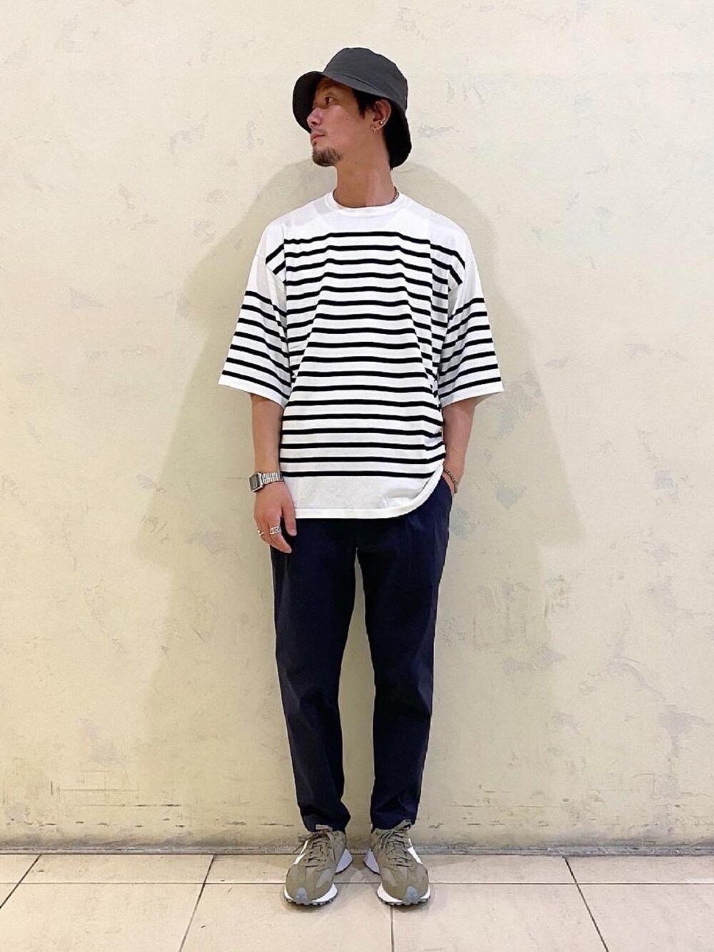 ●年齢:30代前半 ●身長:176cm ●普段サイズ:トップスL/ボトムスM 【サイズ感】 トップス:オーバーサイズシルエット ボトムス:ワイドテーパードアンクル 【素材感】 トップス:レーヨン・ナイロン ボトムス:コットン55%・ナイロン42%・ポリエステル3% 【コーディネートポイント】 ボーダーのニットTシャツがゆるっとしたシルエットなのでパンツにはカジュアルになり過ぎない素材感とシルエットを選びました。シンプルな組み合わせなので足元には別注のnew balanceにしました。カラーを足元に持ってくるのはチャレンジしやすいのでおすすめです。