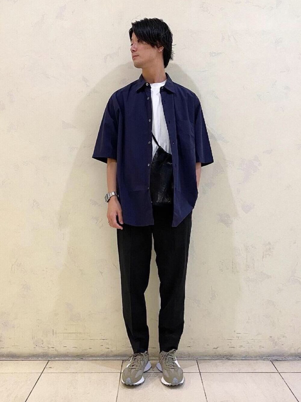 ●年齢:30代前半 ●身長:176cm ●普段サイズ:トップスL/ボトムスM 【サイズ感】 トップス:テーパードシルエット ボトムス:ワイドテーパードシルエット 【素材感】 トップス:コットン100% ボトムス:ポリエステル68%・レーヨン30%・ポリウレタン2% 【コーディネートポイント】 足元に色を入れて目立たせたかった為、シンプルにモノトーンの色合いでまとめてみました。