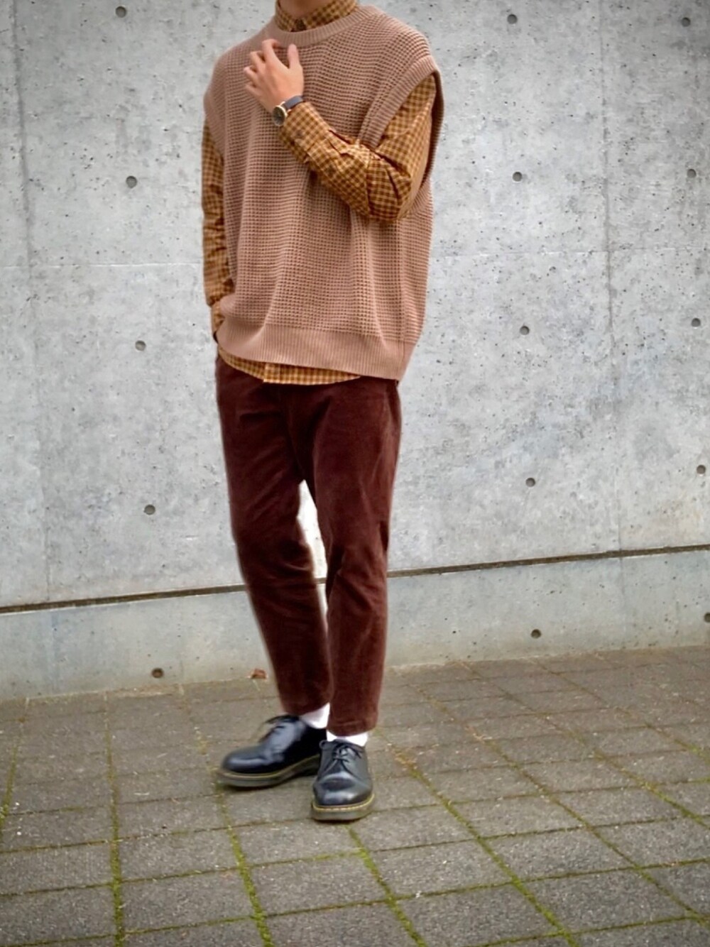 shin のニット/セーター「WEB限定BIGメンアサニットベスト(HARE)」を使ったコーディネート
