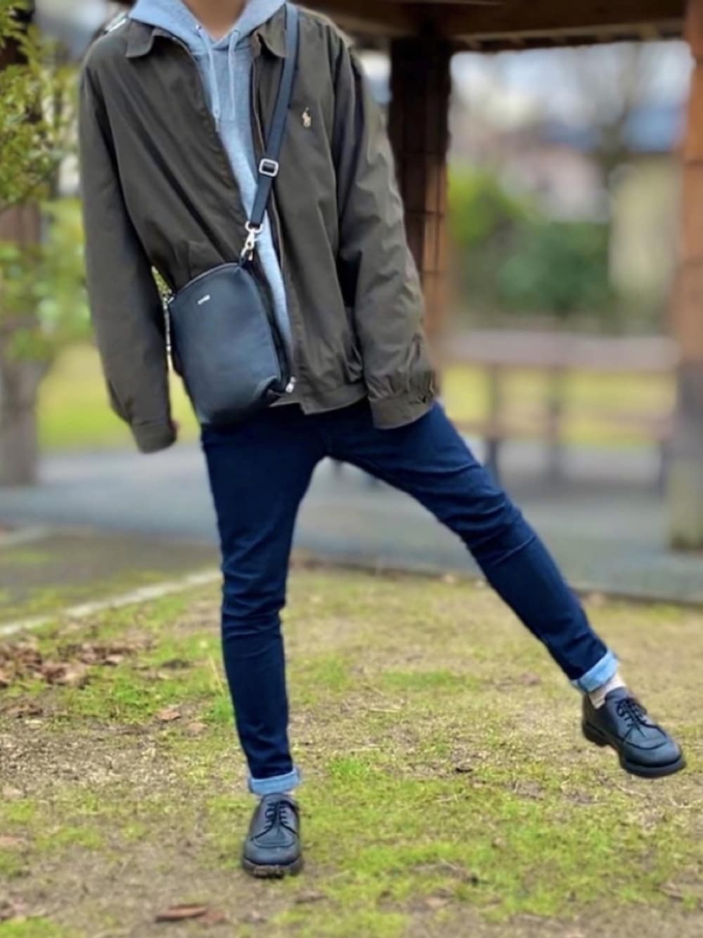 ご覧頂きありがとうございます🍂 RalphLaurenのジャケットを着てみました ワンポイントのシンプルなデザインで気に入っています パンツはレディースですが GUのハイウエストスキニージーンズで合わせました🍃 スキニーは足長効果があるのでよく活用しています😌 ※つま先に土が付いておりますがそこには注目しないでください😂