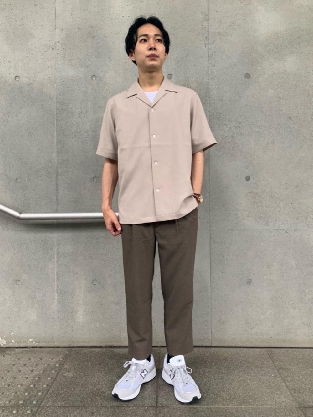 年齢25歳 身長168㎝ 普段サイズ:シャツ、ボトムスMサイズ/シューズ27㎝ 【着心地、素材感】 シャツ:柔らかくふんわりした素材感。 ボトムス:イージーパンツ。軽くてとても涼しい。 【コーディネートポイント】 アースカラーで合わせた統一感のあるコーディネートにしました。綺麗めのシャツにスニーカーを合わせることで程よくカジュアル感のある、ですが崩れすぎないシャツスタイルになります。
