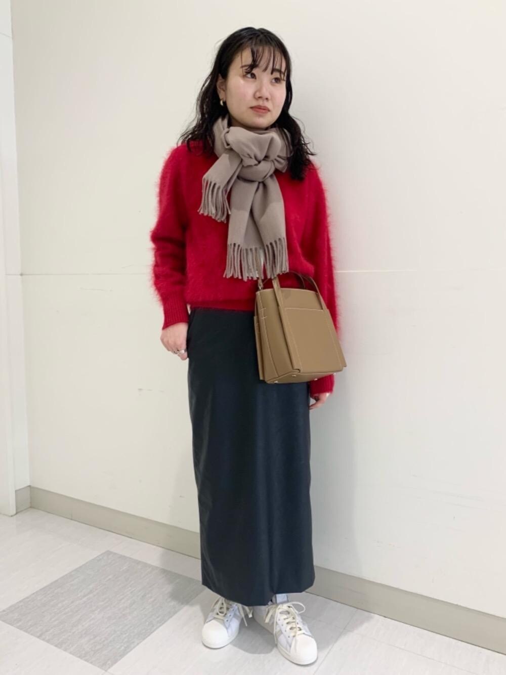 新色のカシミヤのニットでコーディネートしました。今年はニュアンスカラーが多いのでパキッと明るい色みのニットもオススメです!スカート、バック共に新色のご用意になっています。