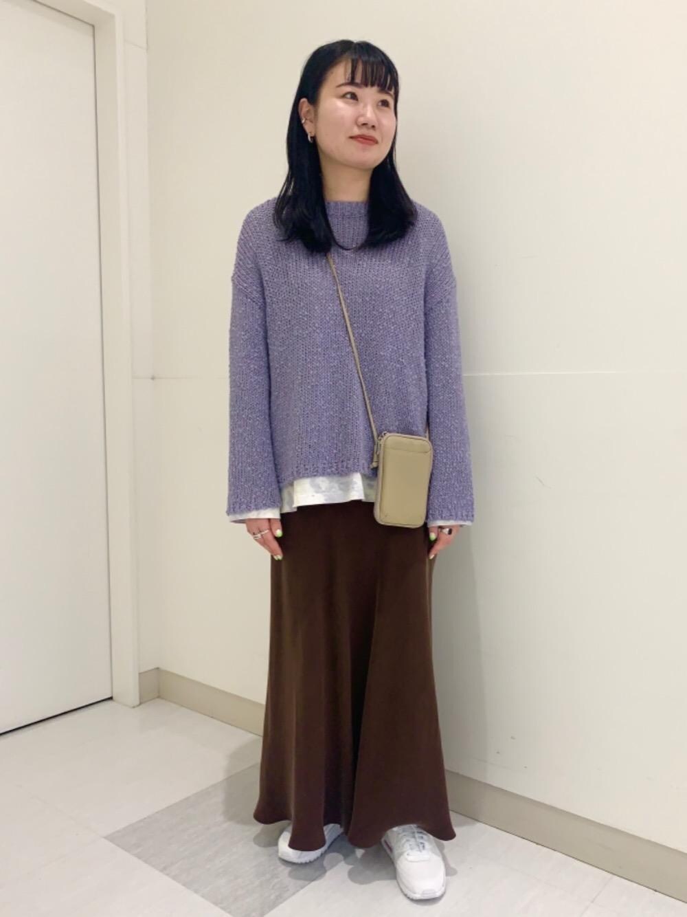 春カラーのニットは麻混のざっくりなサイズ感で、網目も大きくインナーを楽しめる一枚。今回はタイダイ柄のカットソーでレイアードしました!毎回人気のウォレットショルダーも再入荷致しました。