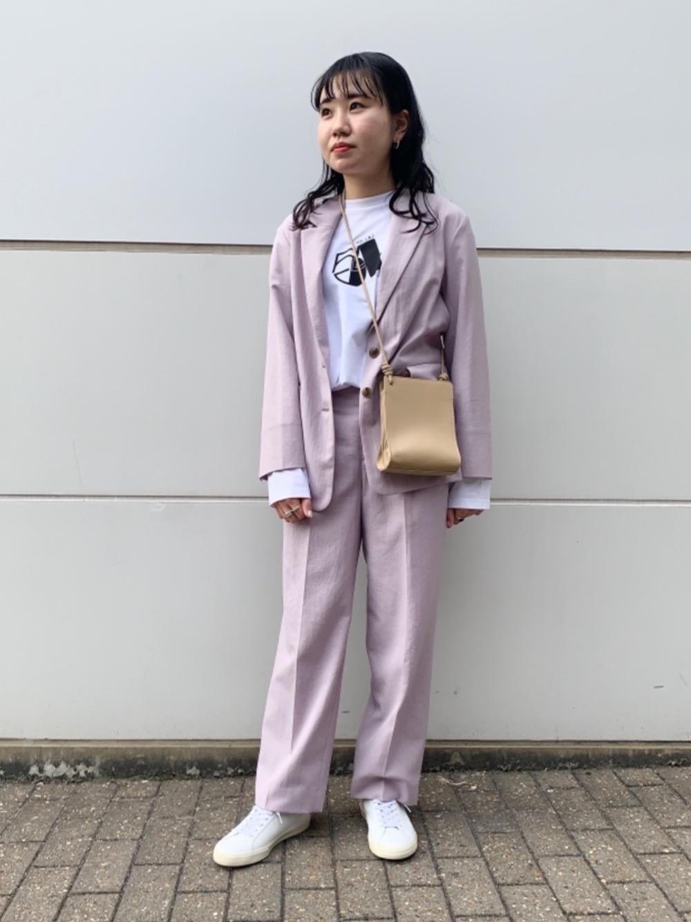 春カラーのセットアップでコーディネートしました。インナーをロゴTで合わせると今年らしい雰囲気に。パンツはタック入りでのストレートワイドのシルエットです。