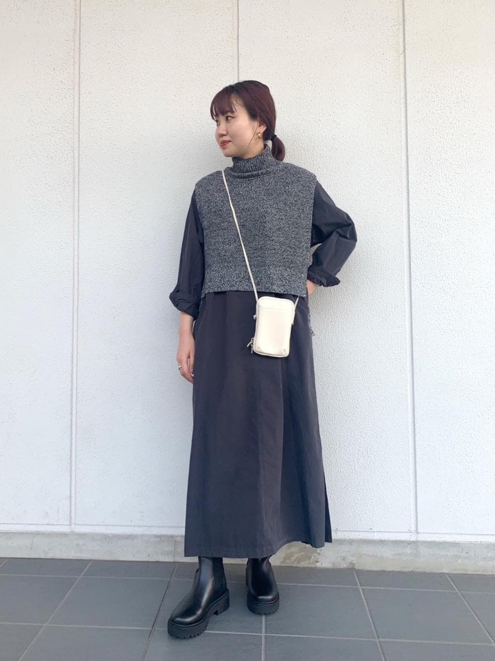身長:160cm 普段サイズ:ワンピース36/シューズ25cm 【サイズ感】 ワンピース:ゆったり 【着心地】 ワンピース: タートルニットベスト付きのシャツワンピース。ワンピース一枚でもお召し頂けまして、素材はコットン100%の適度な張り感がございます。 【コーディネートポイント】 全体的に色味をモノトーンで揃えて、モードな雰囲気にまとめました。ワンピースはそれぞれ単品使いができるので着回し抜群のアイテム。シャツのワンピースはボタンを取り外して頂くと羽織としてもお召し頂けます!