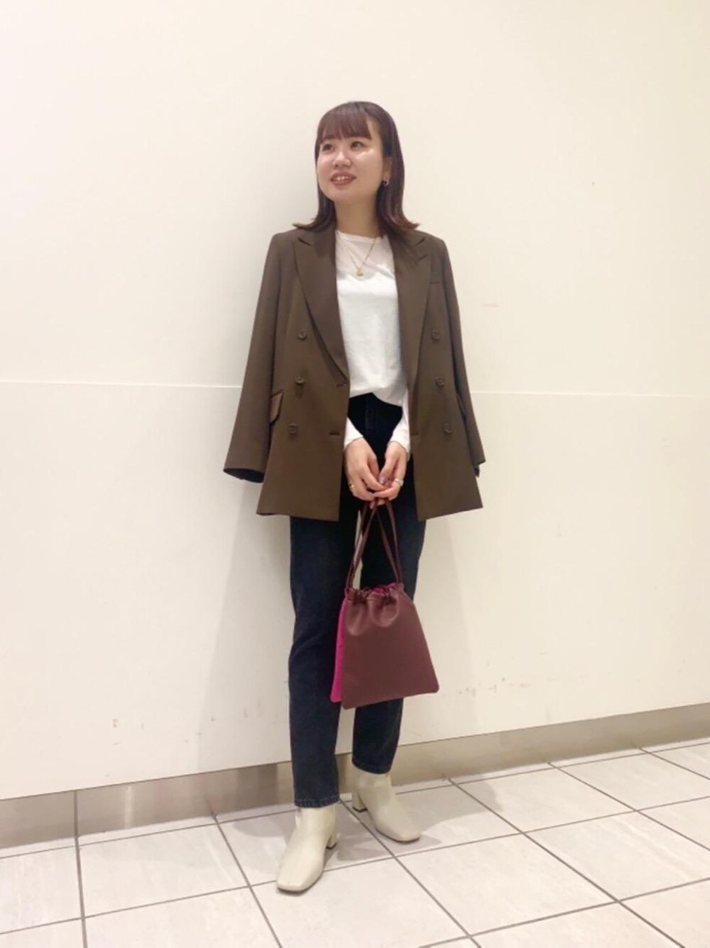 身長160cm 普段サイズ:トップス36.38/ジャケット36/パンツ36 【サイズ感】 トップス:標準 ジャケット:ゆとりのある身幅で着丈長め パンツ:標準 【着心地】 トップス:体にフィットしすぎず、優しい肌触り ジャケット:毛混でありながらも、毛羽が少なく表面がきれいで肌触りが良い素材 パンツ:履き口はファスナーに変更し着脱しやすくなりました 【コーディネートポイント】 ジャケットと足元をヒールで合わせて大人な印象でコーディネートしました。秋冬のコーディネートに活躍するダブルジャケットは着丈長めのデザインでON/OFFどちらでもお使い頂けます。アクセサリーはポイント使いにしたかった為それぞれ単品使いで着用しています。
