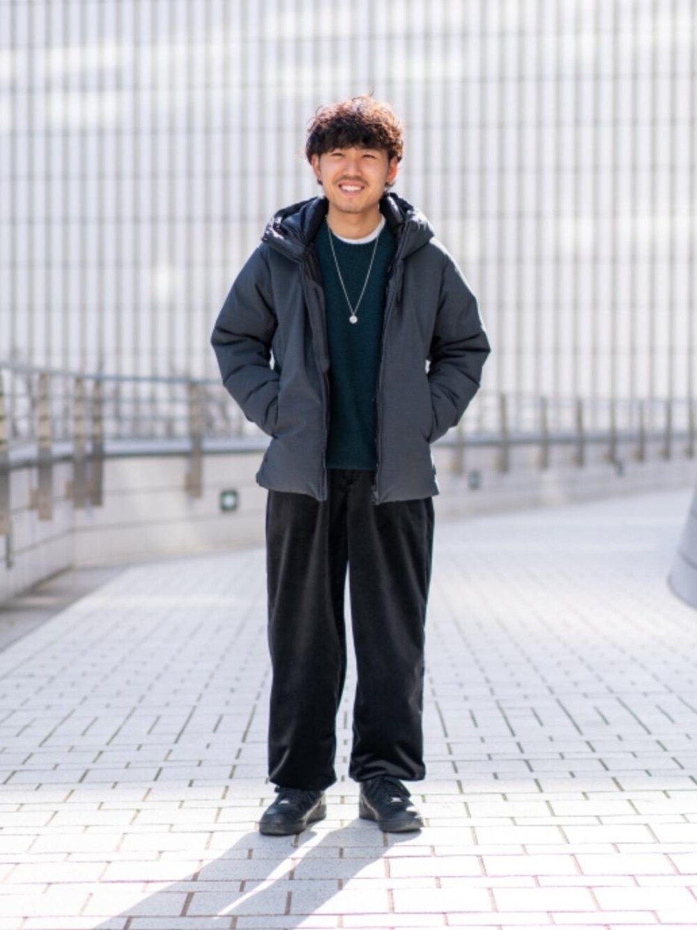 小松マテーレのダウンをメインに、グリーンのニットを合わせ落ち着いたトーンでスタイリングしました。 ダウンはスッキリとしたシルエットで着膨れしないのでおすすめです。