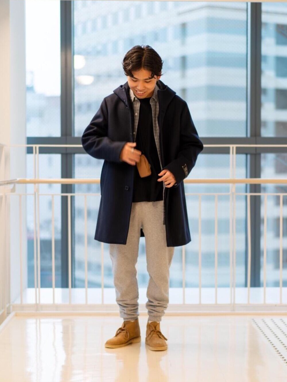 上品な素材のコートにスウェットパンツを合わせてカジュアルなスタイリングにしました。 コートは細身の作りなのでワンサイズ上げてMサイズを着用しております。