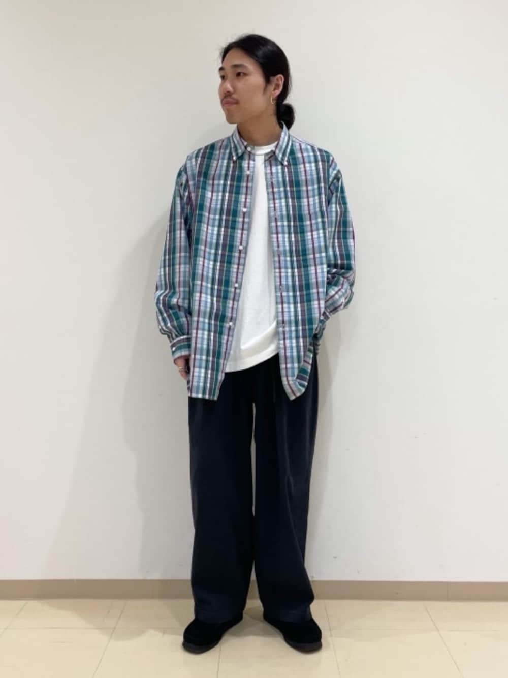●身長:165cm ●普段サイズ:トップスS/ボトムスS シューズ26cm 【サイズ感】 トップス:ゆったり ボトムス:ゆったり 【素材感、着心地】 トップス: コットンナイロン ボトムス:コットン100% 【コーディネートポイント】 マドラスチェックのシャツをメインにスタイリングしました。緩めの絶妙なサイズ感で着やすく、コットンナイロンのハリのある綺麗目な生地感がとても良いです。