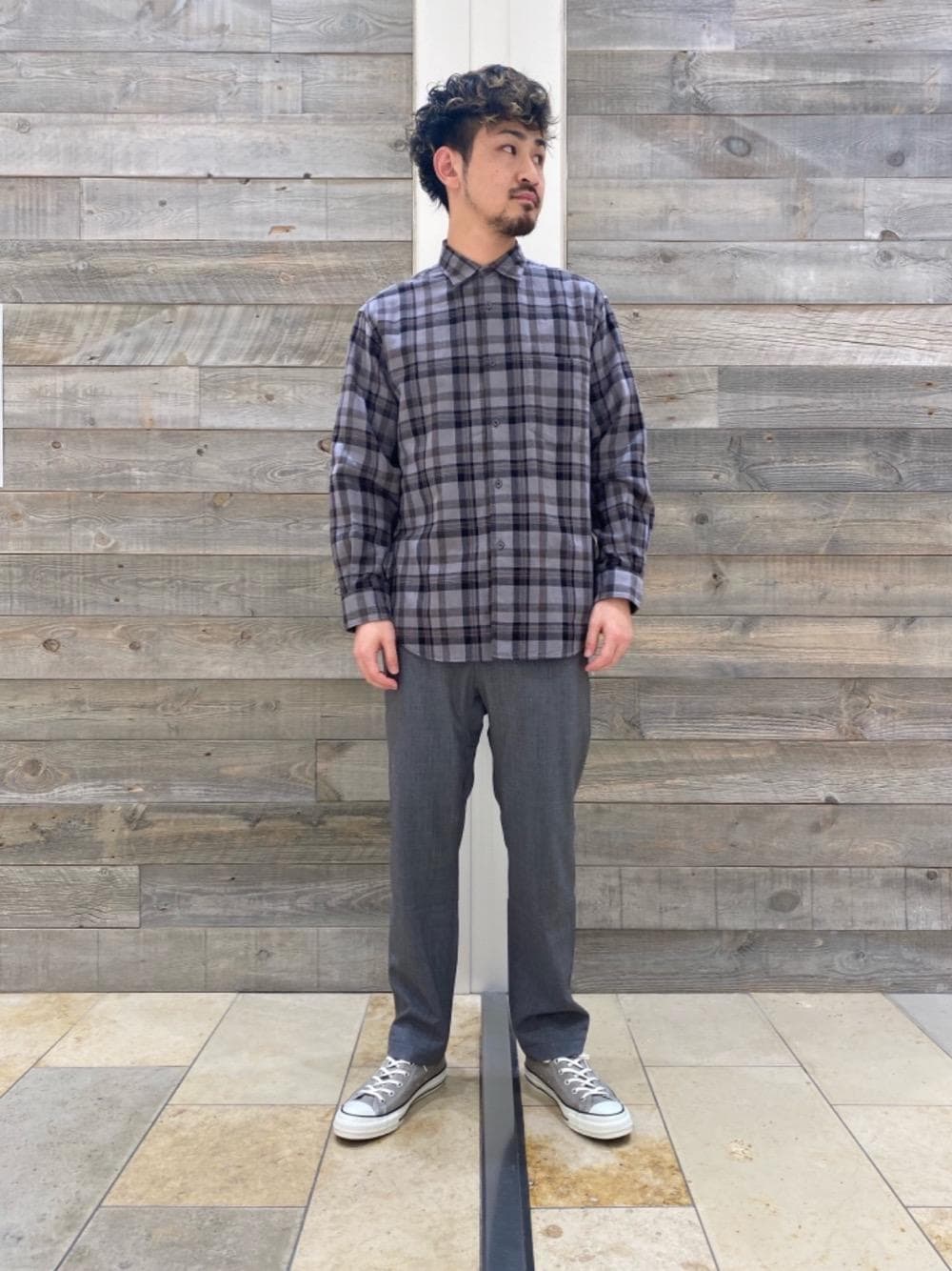 全体をグレートーンでまとめ秋らしさのあるコーディネートに仕上げました。