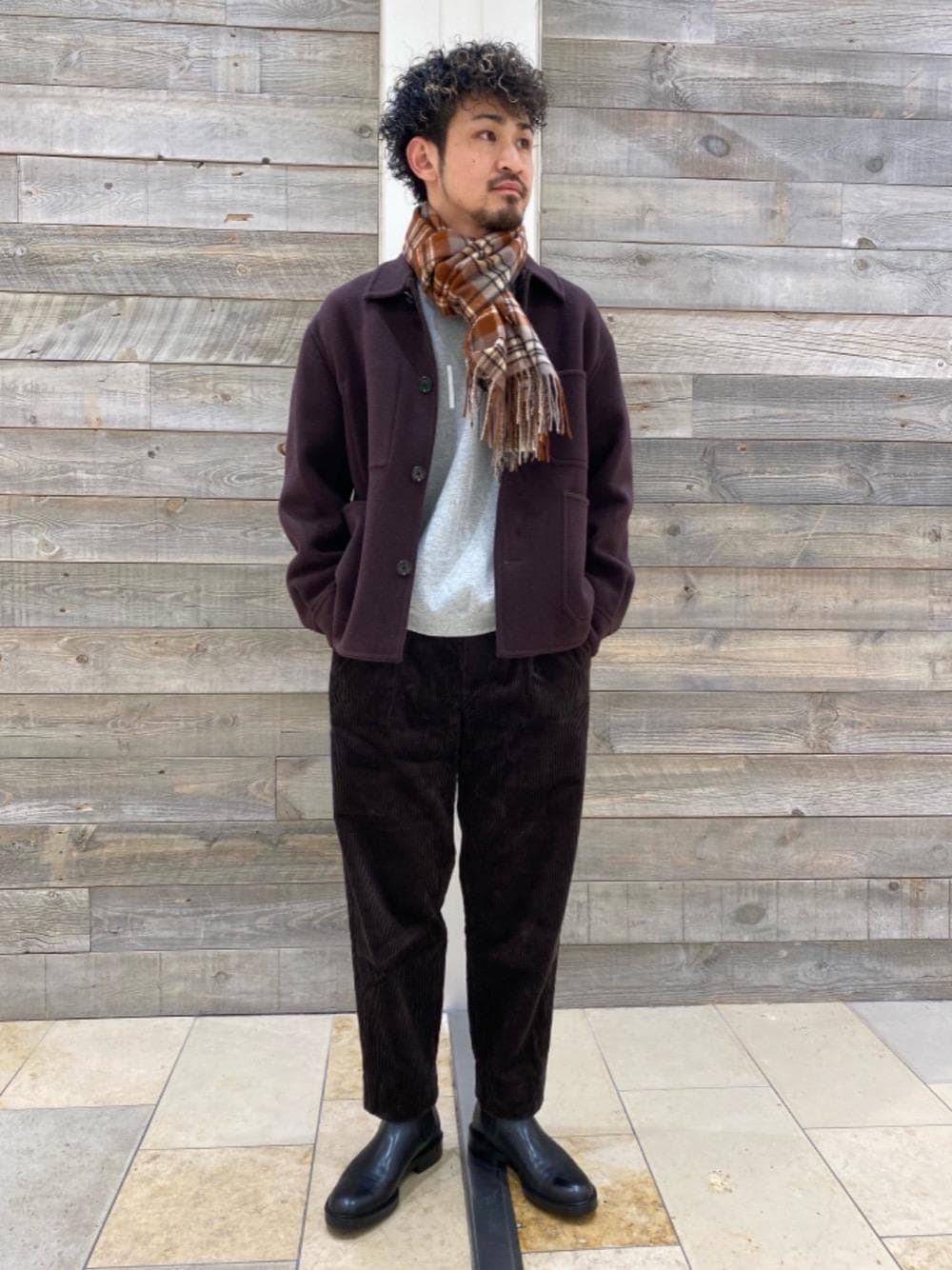 メルトンカバーオールをメインに全体を赤みのあるアイテムでまとめ、カジュアルながらも暖かみのあるコーディネートに仕上げました。 175cm普通体型、インナーに薄手のスウェット着用でジャストなサイズ感。 ショート丈なのでレイヤードを楽しめるシルエットです。裏地もチェック柄なのもデザインポイント