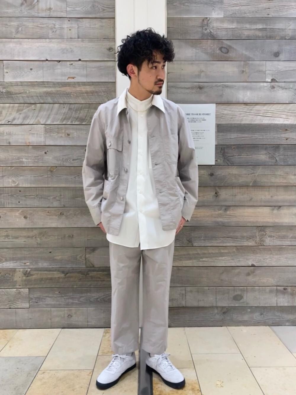 淡い色でシボ感とハリのあるカバーオール。 コットンナイロンのお素材なので見た目も着心地も軽やかな印象で着用していただけます。 ホワイト、グレーの2トーンカラーで爽やかさを意識したコーディネートに仕上げました。