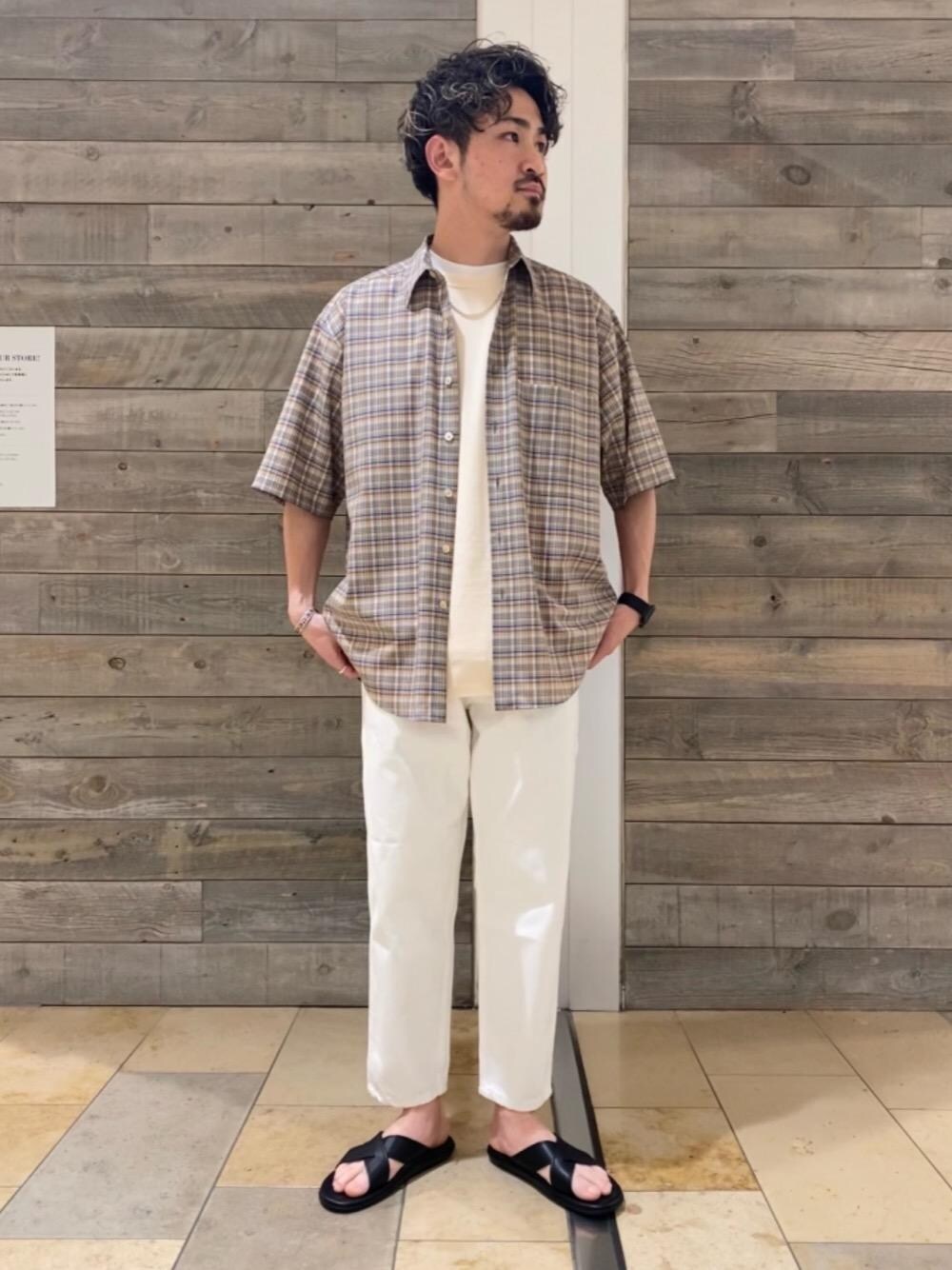 <AURALEE>BY別注半袖シャツをメインにコーディネートを組みました。 配色のいいチェック柄は、1枚羽織るだけでコーディネートの主役に。 上質なウール素材を使用しており、夏でもサラッと快適に着ていただけます。