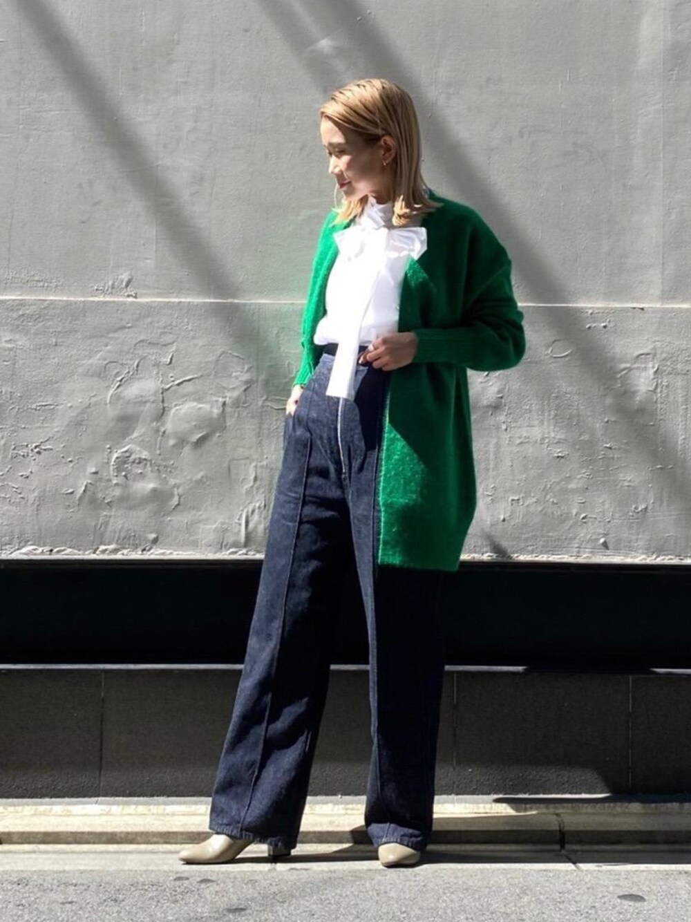 ・身長 159cm ・普段サイズ トップス36/ボトムス36・38/シューズ36h・37(23.5・24cm) 【サイズ感】 シャツ:標準的 パンツ:標準的 シューズ:標準的 【素材感・着心地】 シャツ:コットン素材でハリ感ありますが、柔らかい風合い。 カーディガン:モヘヤを含む素材で、やや起毛感あり。 パンツ:デニムパンツですが、硬すぎず程よいハリ感。 シューズ:ヒール部分が6.5センチありますが、太めのチャンキーヒールで歩きやすい。 【コーディネートのポイント】 ボウタイブラウスにデニムパンツを合わせて、カジュアルダウンしたコーディネート。グリーンのカーディガンはボタンレス仕様のため、綺麗めブラウスとも相性良く合わせていただけます。