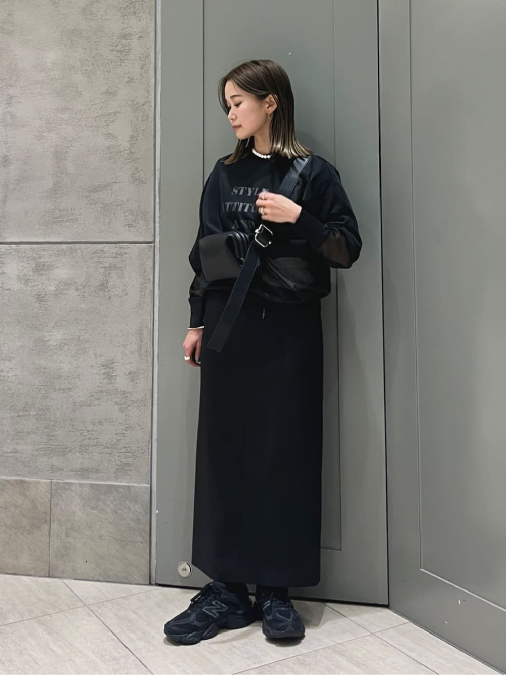 【サイズ感】 Tシャツ:ややゆったり 袖まわり、身幅ゆとりあり ニット:やややったり スカート:ややゆったり、 丈長め シューズ:標準的 【コーディネートのポイント】 ロゴTシャツをアクセントにブラックのワントーンでまとめたカジュアルコーディネート。 小物もブラックで少しモードな雰囲気で合わせました。