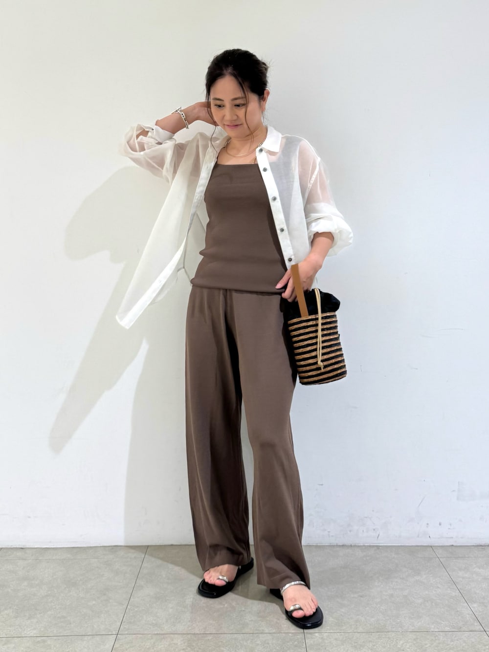 【シャツ】 着用サイズ:F ▼素材感・着心地 ・体のラインを拾わないシルエット◎ ・後ろ丈はヒップ隠れる丈感👏 ・ポリエステル100%でややハリ感のある一着です。 ・程よい透け感 ・手洗い可能🫧 ▼コメント 程よいシアー感がおしゃれな1着です✨ カーディガン代わりにもおすすめなアイテムです🫶 【インナー】 着用サイズ:F ▼着心地・生地感 ・滑らかな肌触りで着心地✨ ・程よいフィット感と伸縮性あり。 ・レーヨン・ナイロン素材。 ・接触冷感🌿 ・手洗い可🫧 ▼コメント スクエアデザインがデコルテを綺麗に見せてくれ、1枚で着てもオシャレです😎 インナーとしても重宝するデザインです✨ 【パンツ】 着用サイズ:36 ▼着心地・生地感 ・滑らかな肌触りで着心地✨ ・レーヨン・ナイロン素材。 ・足のシルエットを拾わないストレートワイドシルエット👖 ・接触冷感🌿 ・手洗い可🫧 ▼コメント 旅行にもオフィスにもオススメです✈️✨ ぜひ同素材のスリーピースで揃えていただきたいイチオシアイテムです🫶