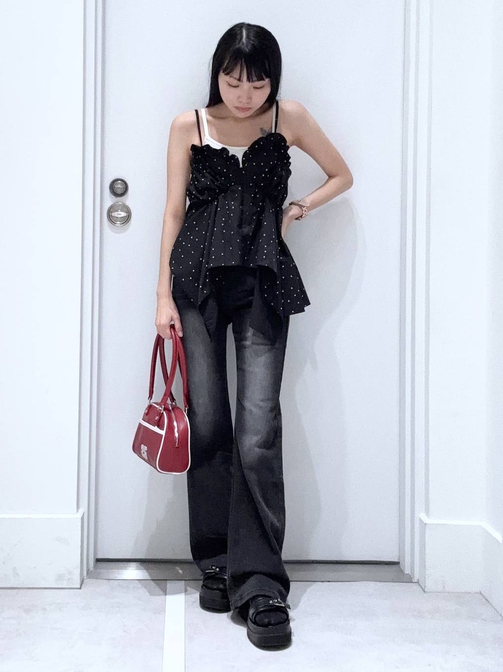 【トップス】 トレンドのドット柄を取り入れたキャミチュニック★ フリルデザインと、イレヘムデザインがポイントです💞 【ボトムス】 履き心地抜群のフレアデニムです🩳 シルエットもめちゃくちゃ綺麗に着ていただけます! 明るめの色はこれからの季節にも使いやすくておすすめです!!
