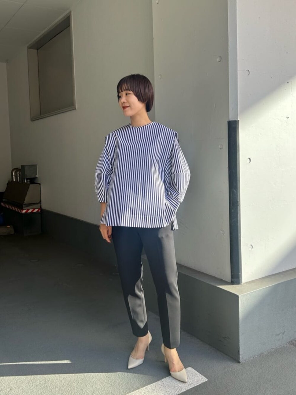 ●身長164㎝ ●普段サイズ:トップス38/ボトムス38/シューズ37h 【サイズ感】 ブラウス:標準的 パンツ:ウエストゴム仕様。伸縮性あり 【コーディネートポイント】 ストライプ柄がメインなブラウスをメインにコーディネートしました。 ハリ感のあるブラウスは幅広いシーンでお召しいただけます。