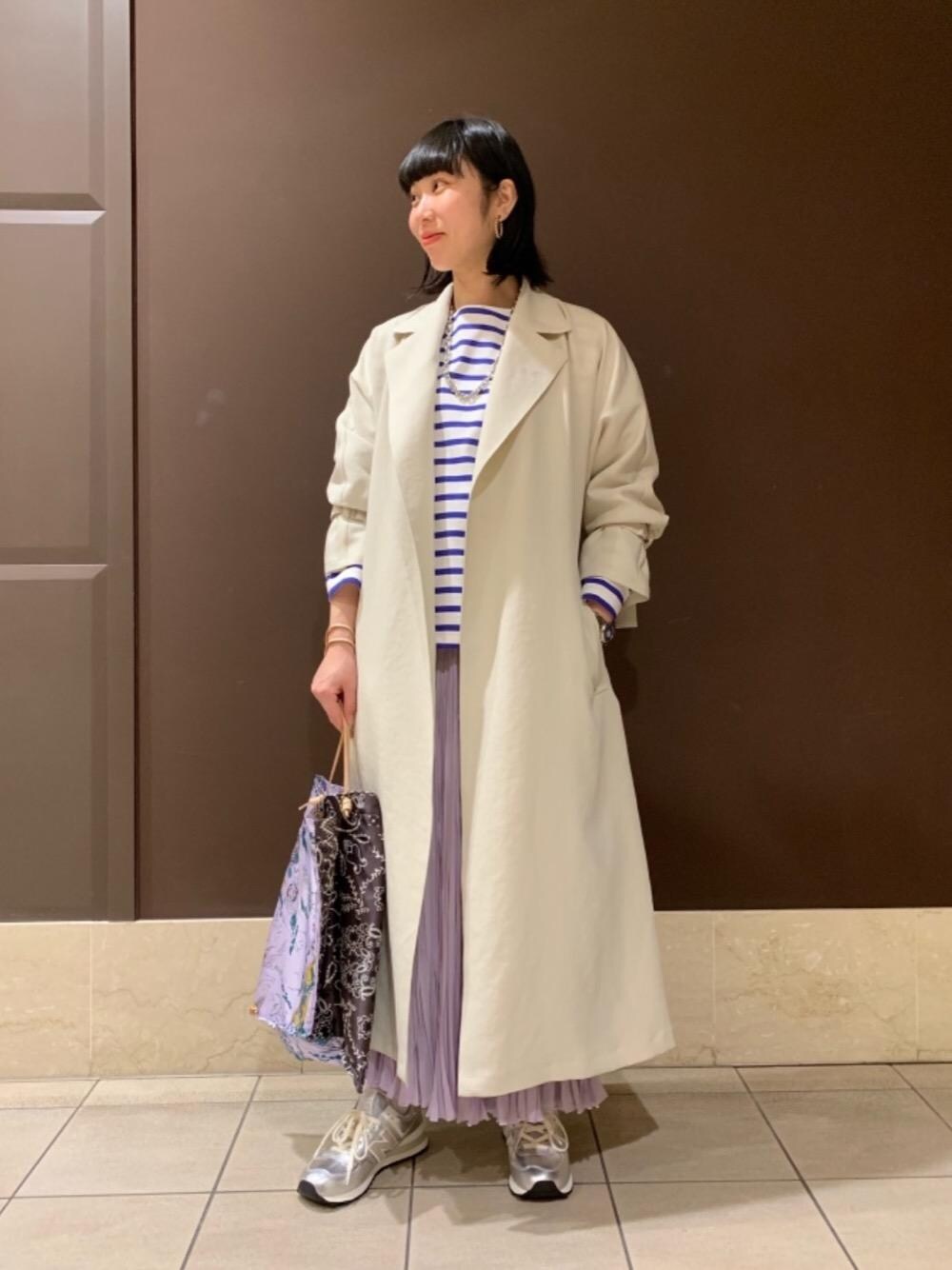 とろみのあるテーラードコートにハリのあるカットソーを合わせ、メリハリあるスタイリングにしました。 カジュアル要素の強いボーダーでも、合わせる素材に光沢のあるものを選ぶと、キレイめにも着て頂けます。 シルバーの小物を取り入れトレンド感も意識しています。