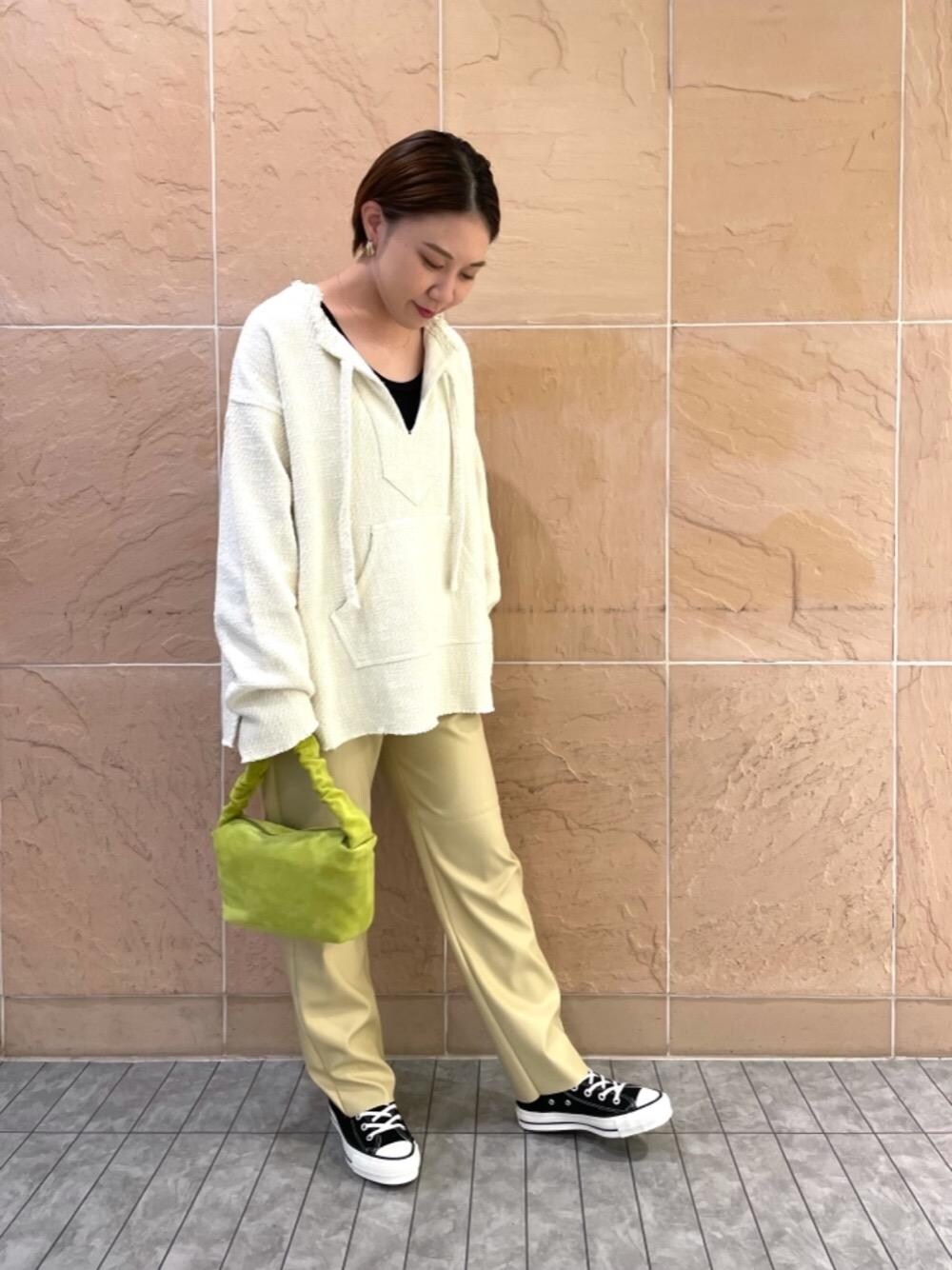 [身長] 157cm [普段サイズ] トップスS(36)/ボトムスS(36)/シューズ24.5cm [サイズ感] トップス:標準的 ボトムス:標準的 シューズ:標準的 [素材感] トップス:綿100% ボトムス:合成皮革 [着心地] トップス:ゆとりあり ボトムス:ウエストゴム/ややゆとりあり [コーディネートポイント] フェイクレザーのパンツは、ゆとりのあるものとも合わせやすくなっております。またバッグにピスタチオカラーを入れて、トレンド感を出しました。