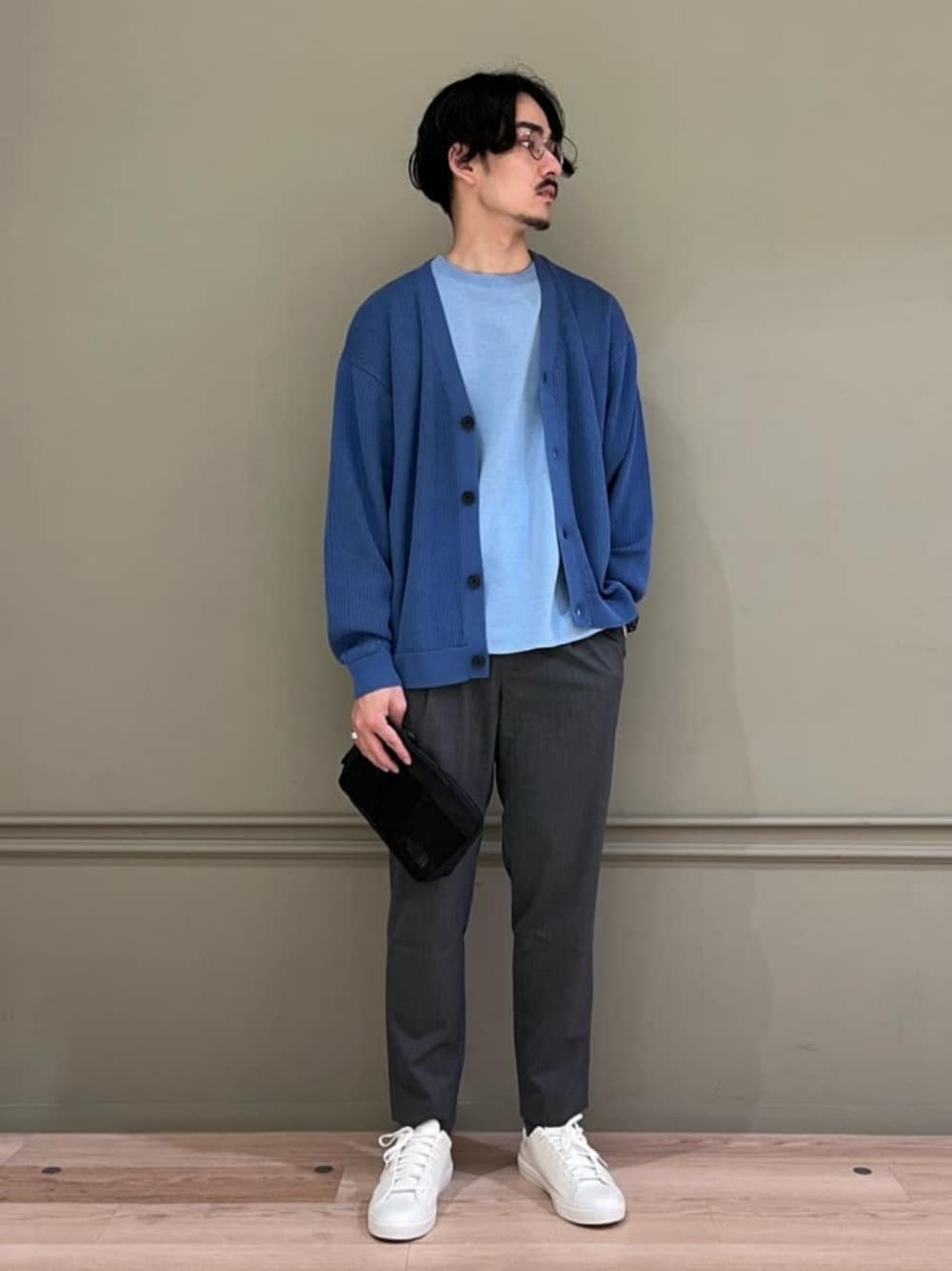 【サイズ感】 カーディガン:ゆったり Tシャツ:ややゆったり パンツ:標準的、腰回りゆとりあり シューズ:やや大きめ 【コーディネートポイント】 ブルー×グレーの王道の組み合わせで、大人っぽくなるよう合わせました。 カーディガンはメッシュ生地で通気性に優れています。