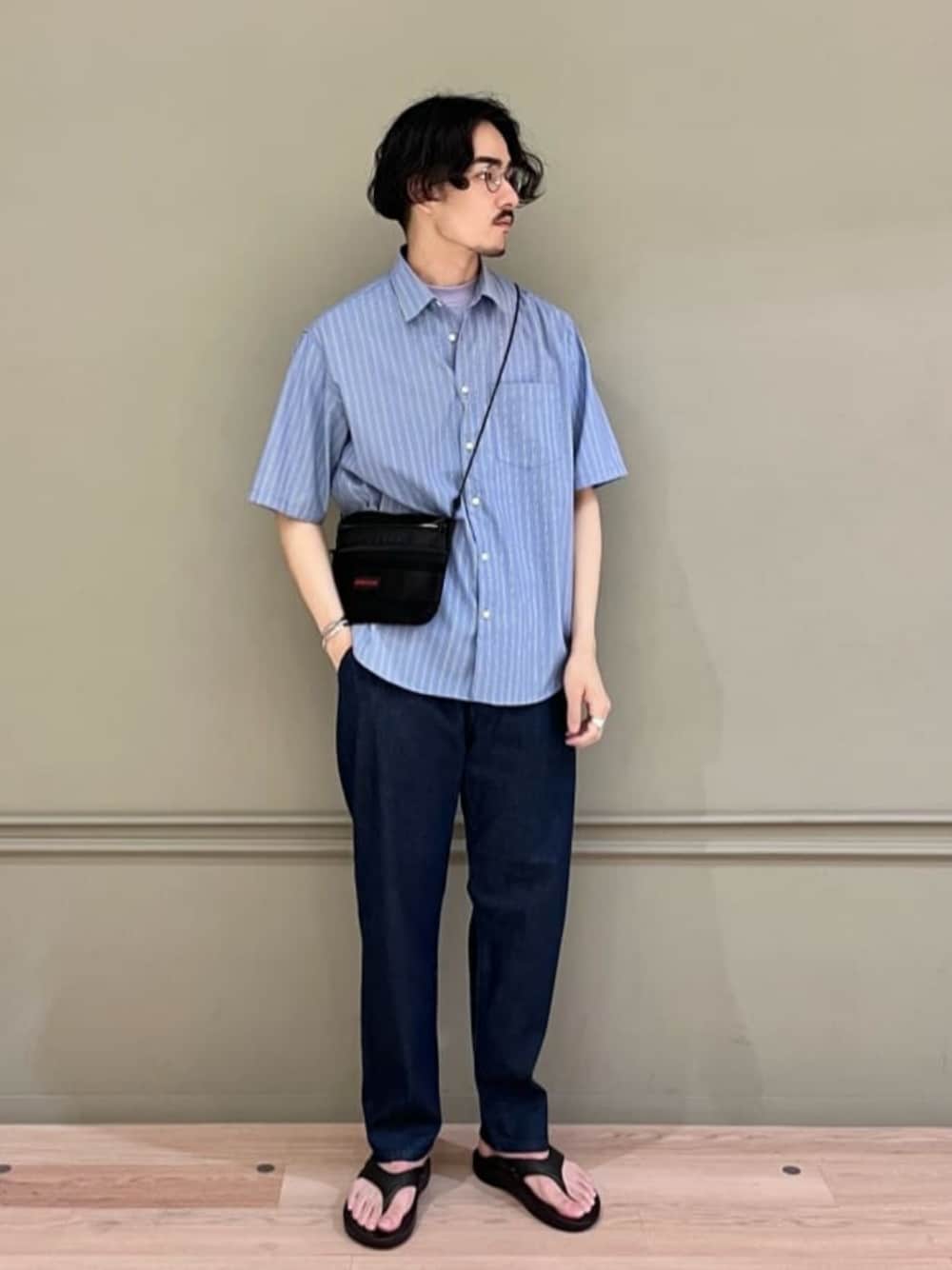 【サイズ感】 シャツ:ややゆったり Tシャツ:標準的 パンツ:ややゆったり、ウエストサイズ調節が可能 サンダル:標準的 【コーディネートポイント】 ブルー×ブラックの爽やかになりすぎないコーディネートです。シャツにデニムとサンダルを合わせることでカジュアルダウンを意識しました。