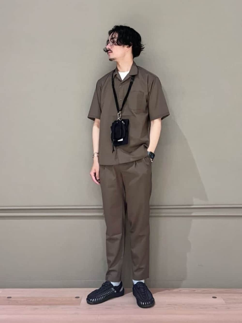 【サイズ感】 シャツ:標準的 Tシャツ:標準的 パンツ:標準的、腿周りゆとりあり サンダル:標準的 【コーディネートポイント】 ウォッシャブルトロシリーズのセットアップです。 モカの色味が重くなりすぎないよう、白のTシャツで爽やかになるよう意識しました。