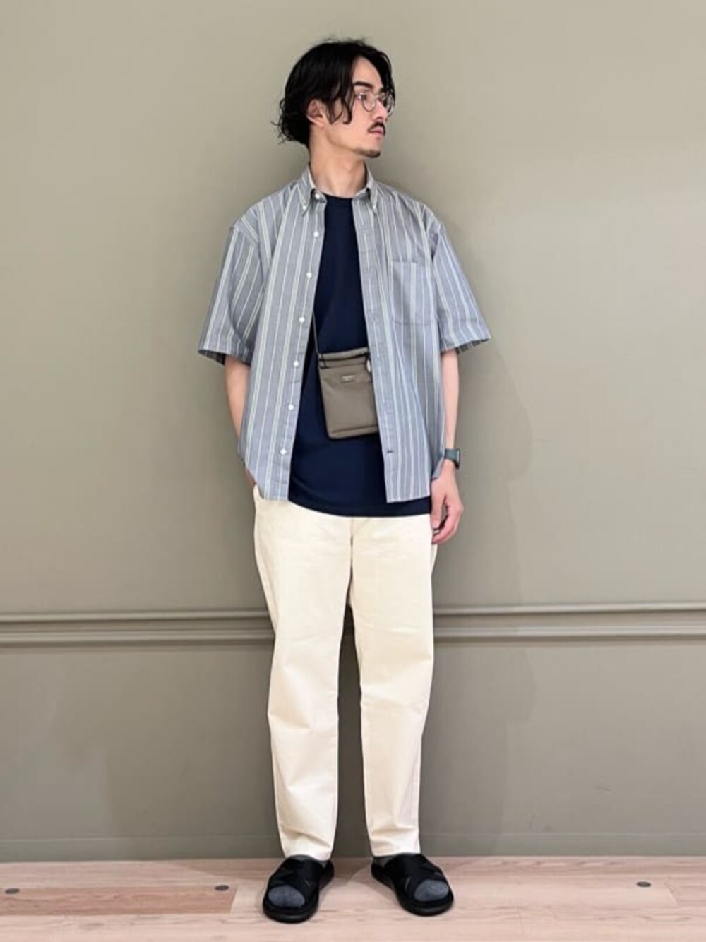 【サイズ感】 シャツ:ややゆったり Tシャツ:ややゆったり パンツ:ややゆったり サンダル:標準的 【コーディネートポイント】 半袖シャツスタイルをカジュアルにまとめました。