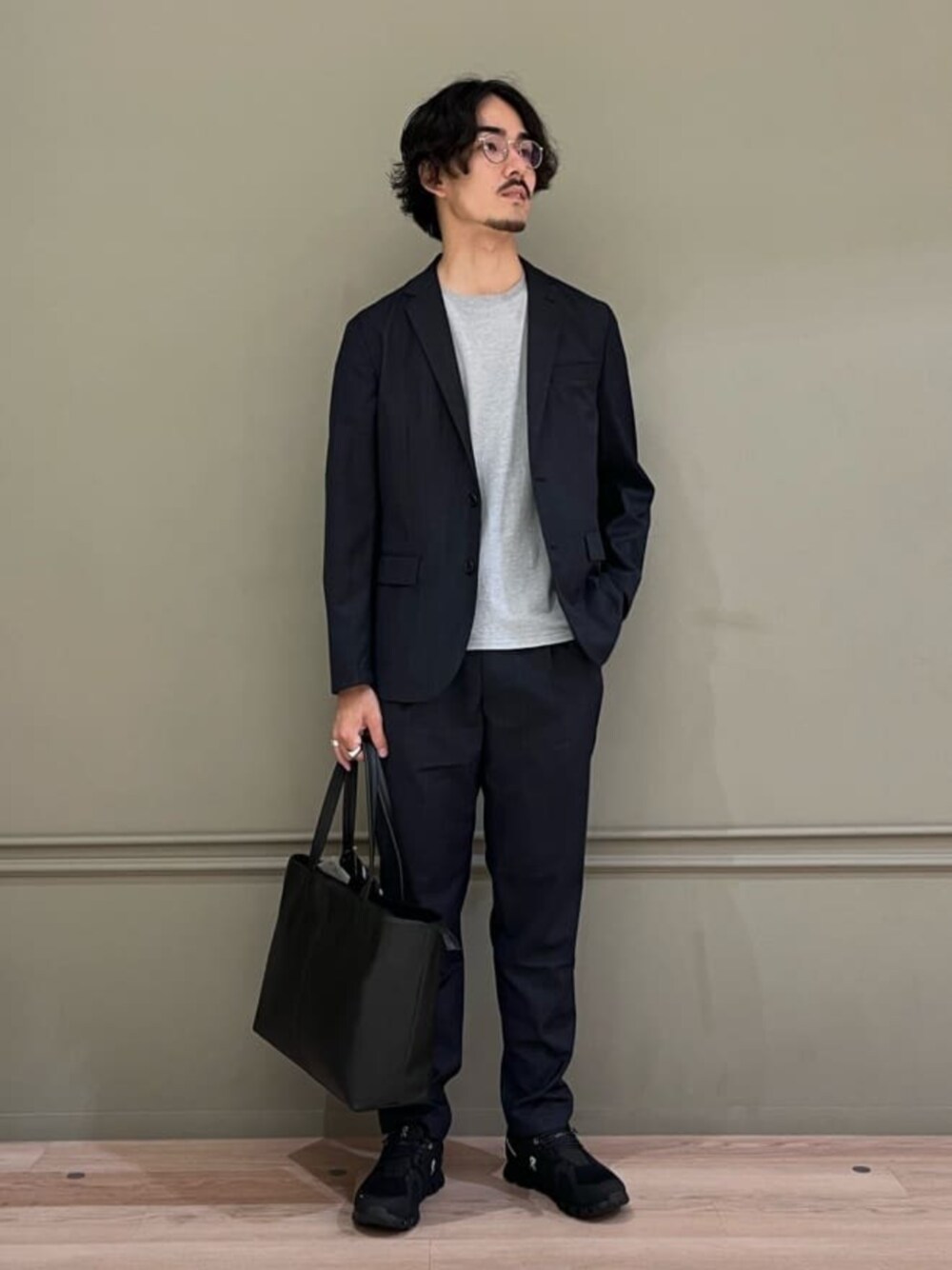 【サイズ感】 ジャケット:標準的 パンツ:腿周りはゆとりあり、裾幅はふくらはぎで張らない程度に細身 シューズ:標準的 【コーディネートポイント】 秋冬の始まりのセットアップスタイルを、スポーティに着崩しました。