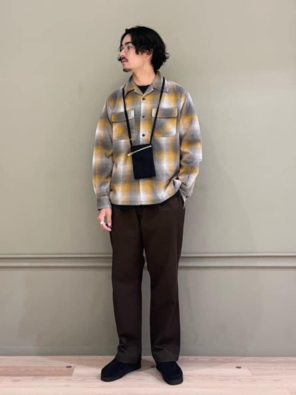 【サイズ感】 シャツ:ややゆったり、着丈はすっきりめ パンツ:ゆったり シューズ:標準的 【コーディネートポイント】 鮮やかなイエローのチェックにブラウンの太めのパンツで、色味も暖色系で合わせました。