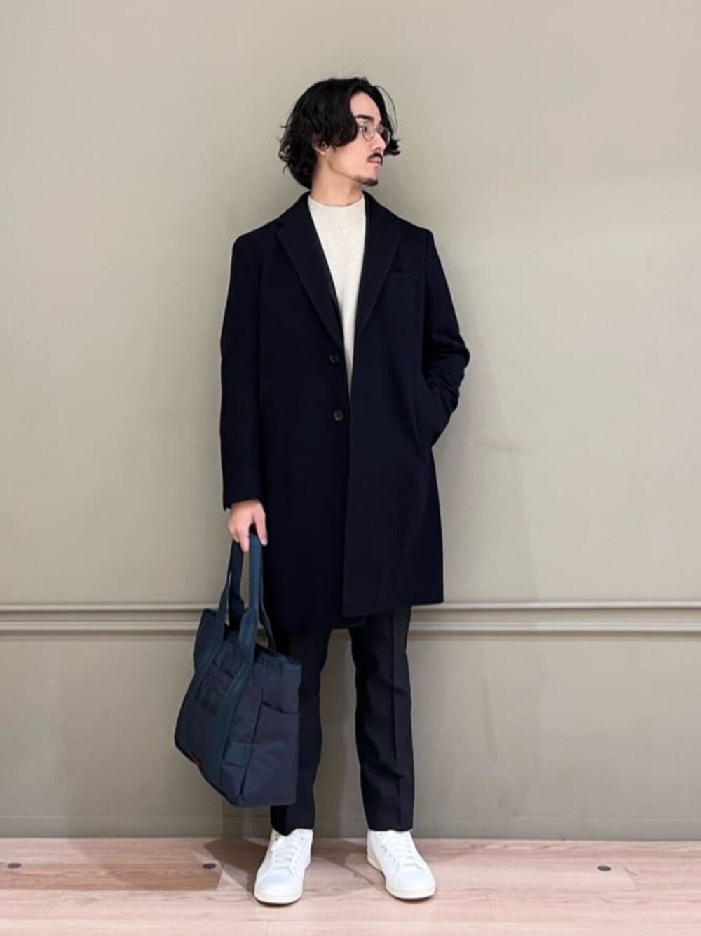 【サイズ感】 アウター:ややゆったり ジャケット:身幅ややゆとりあり ニット:ややゆとりあり パンツ:標準的 シューズ:標準的 【コーディネートポイント】 ネイビーで統一した、オフィスカジュアルの出勤スタイルです。