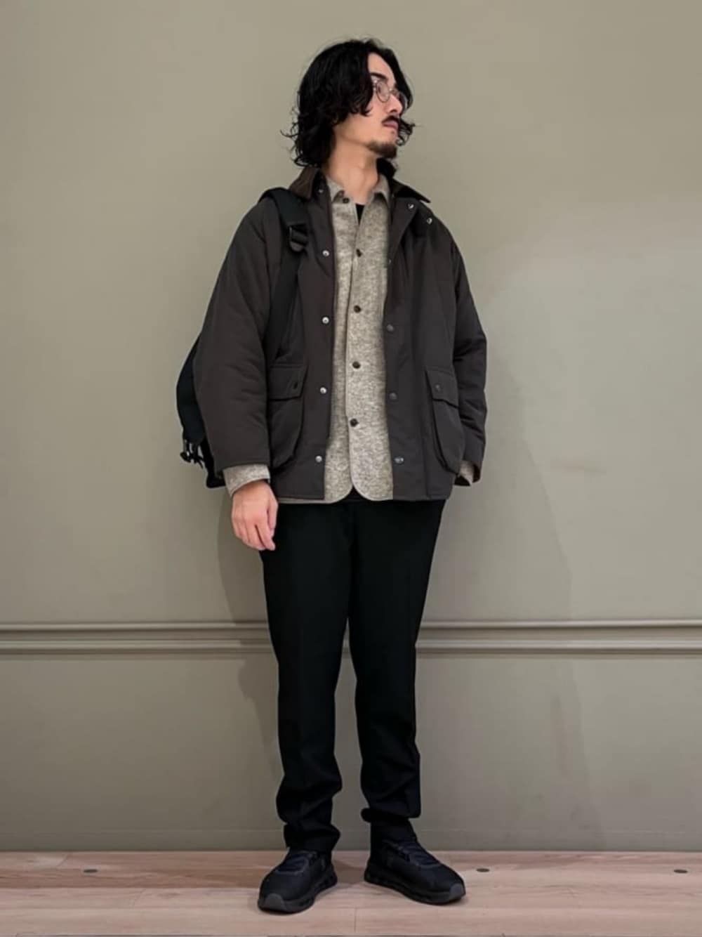 【サイズ感】 アウター:ややゆとりあり シャツ:ゆったり パンツ:標準的 シューズ:標準的 【コーディネートポイント】 素材感の珍しいシャツをインナーのアクセントにしました。