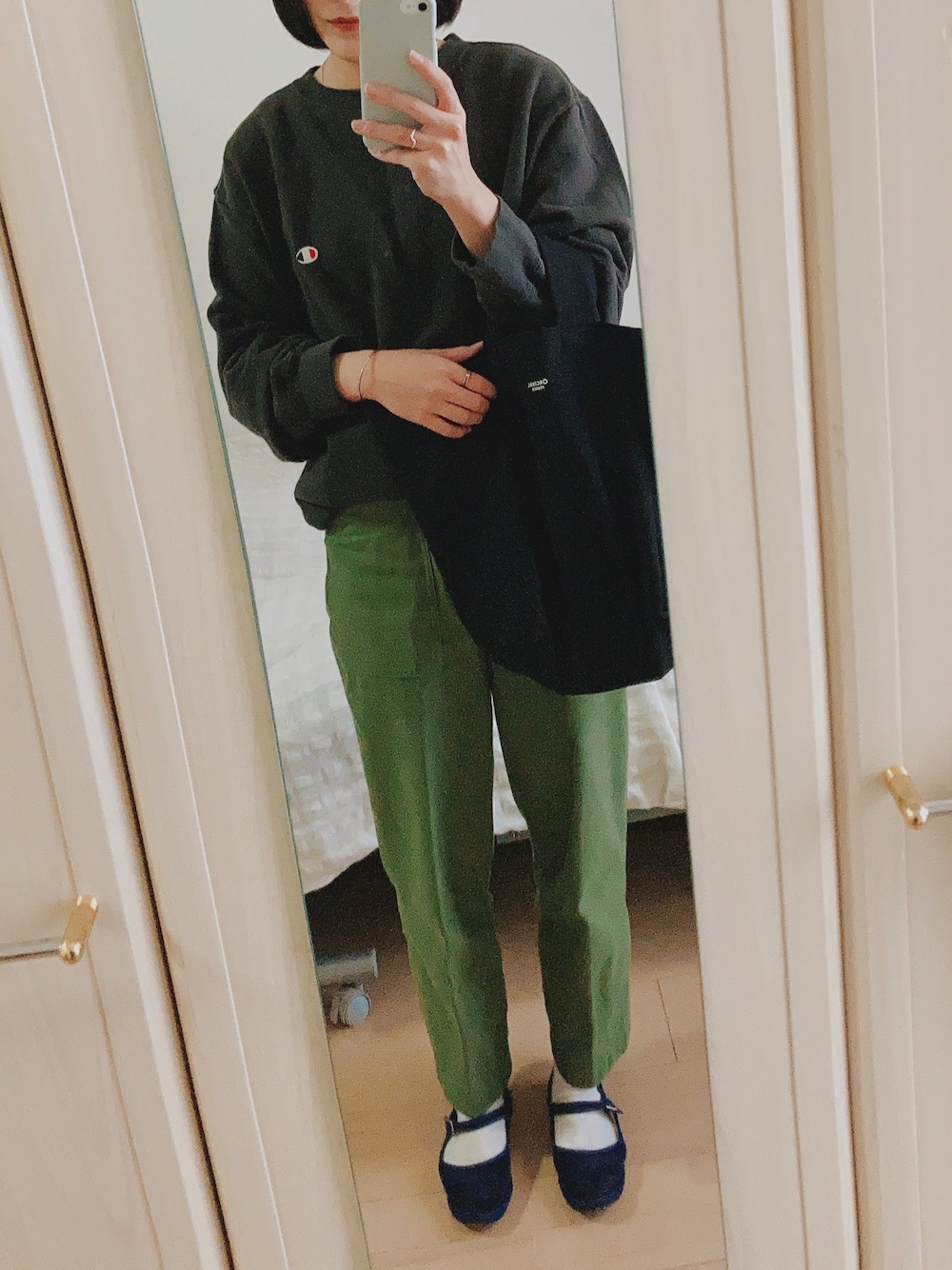スウェット : 古着champion パンツ : THE SHINZONE 靴 : drogheria Crivellini バッグ : orcival