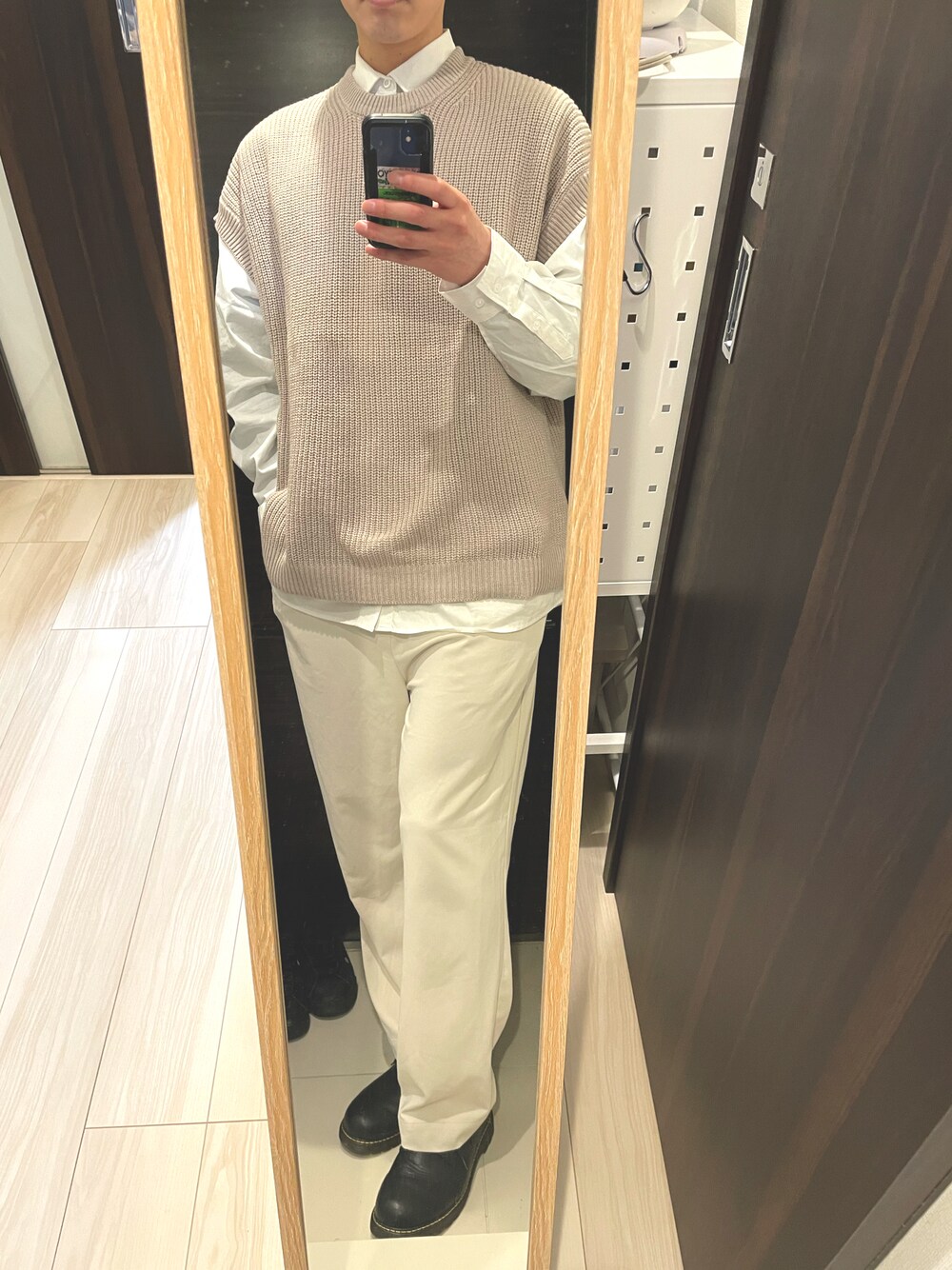 白シャツとニットベストの春っぽいベージュコーデです! 淡い色でまとめてみました!