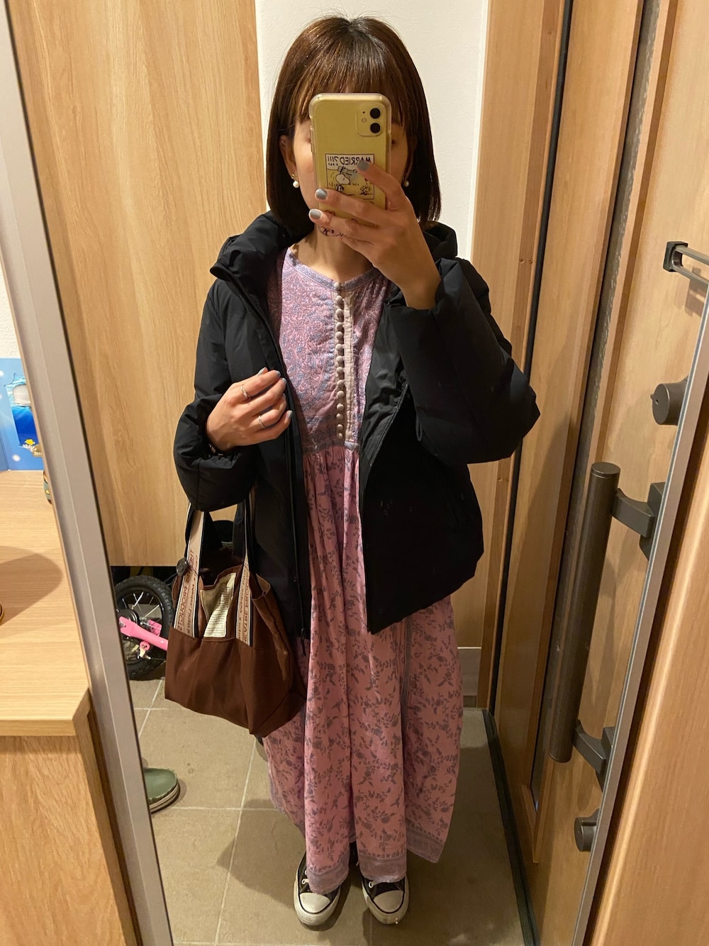 ダウンとワンピースって ワンツーで決まるから楽 コンバースはベージュでもよかったな