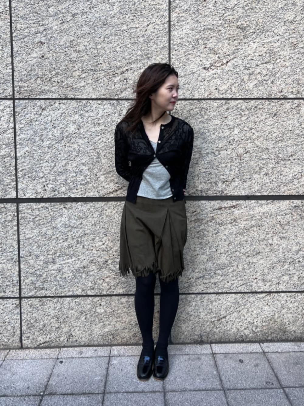 ♢身長:161cm ♢普段サイズ:トップスS-M | ボトムス:S-Mシューズ:23.5-24.0cm 【 サイズ感 】 カーディガン:フリーサイズ、レースの透け感あり スカート:36 ゆったりめ、サイドファスナー 【 コーディネートポイント 】 女性らしさのあるアイテムにミニタリー要素も合わせたコーディネートです。