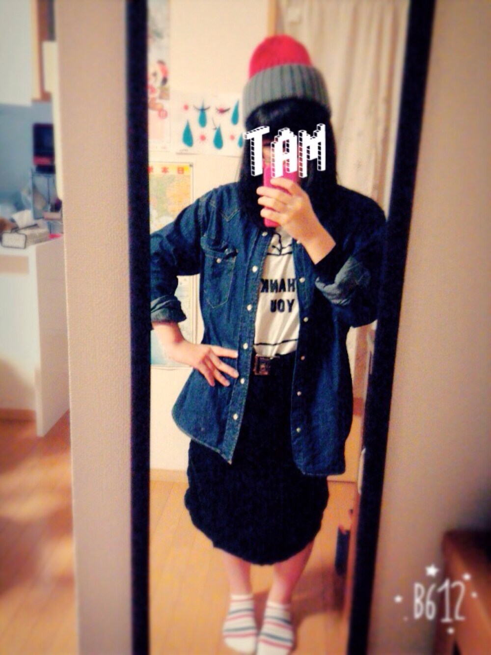 ゆるゆるなメンズのデニムシャツなのでベルトでしめてみました 差し色をニットキャップで入れてるのでくつとかも赤にしたらかわいいかもしれないです