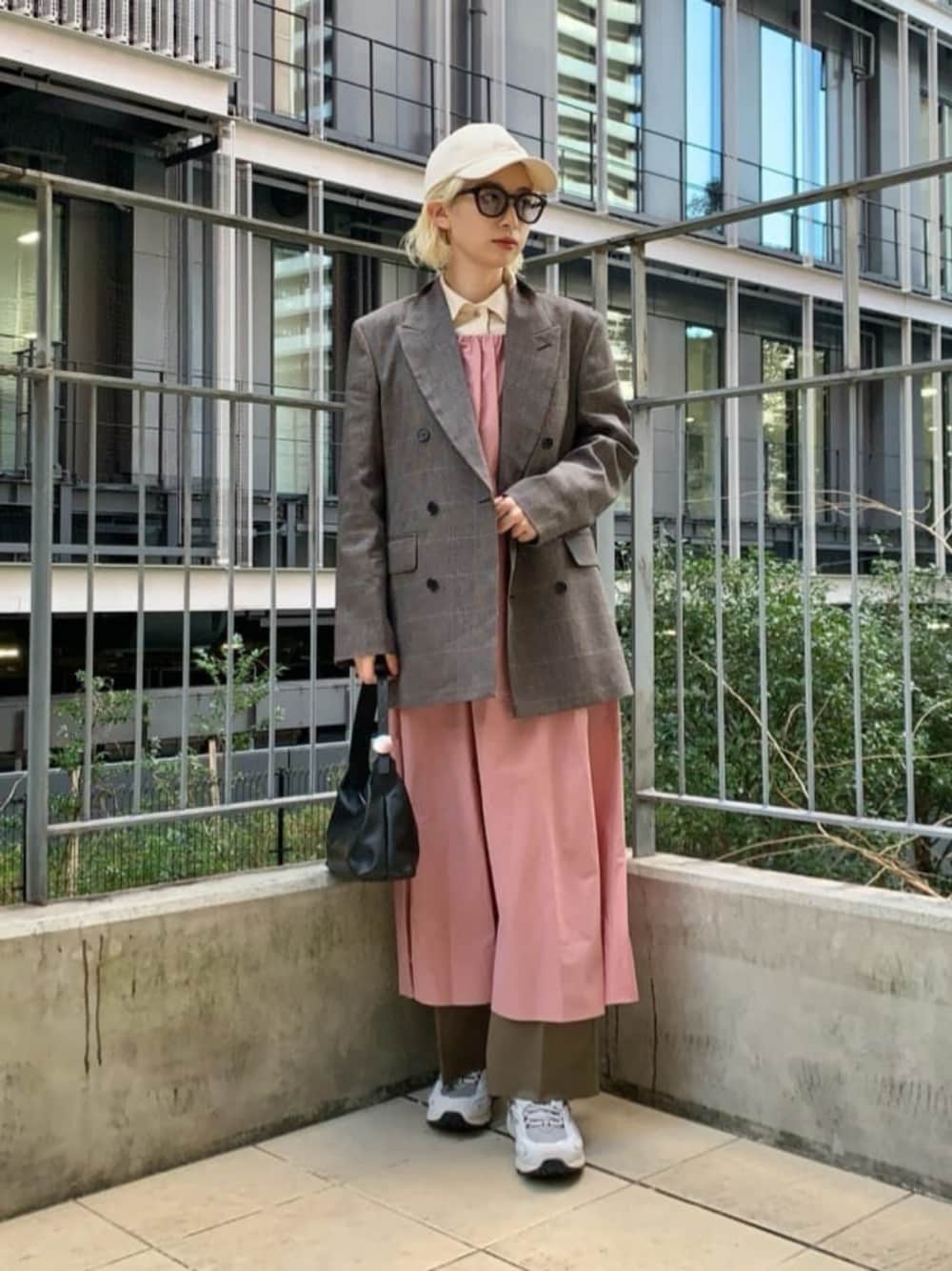 【サイズ感】 トップス→ゆったり ワンピース→ゆったり パンツ→ゆったり 【コーディネートポイント】 色味が目を引くワンピースを主役にレイヤードしました。ジャケットとパンツは少しトーンを落として締めました。