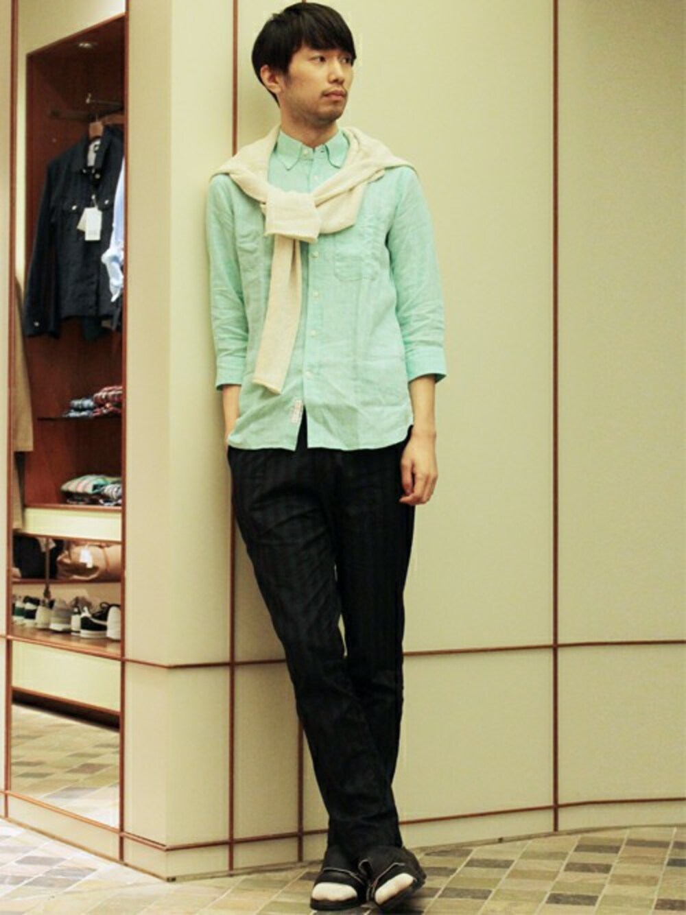 ミントカラーのリネンシャツが目を惹くコーディネート。コットン素材のパンツを合わせているため、これからの季節に最適。肩にかけたカーディガンもポイントです。