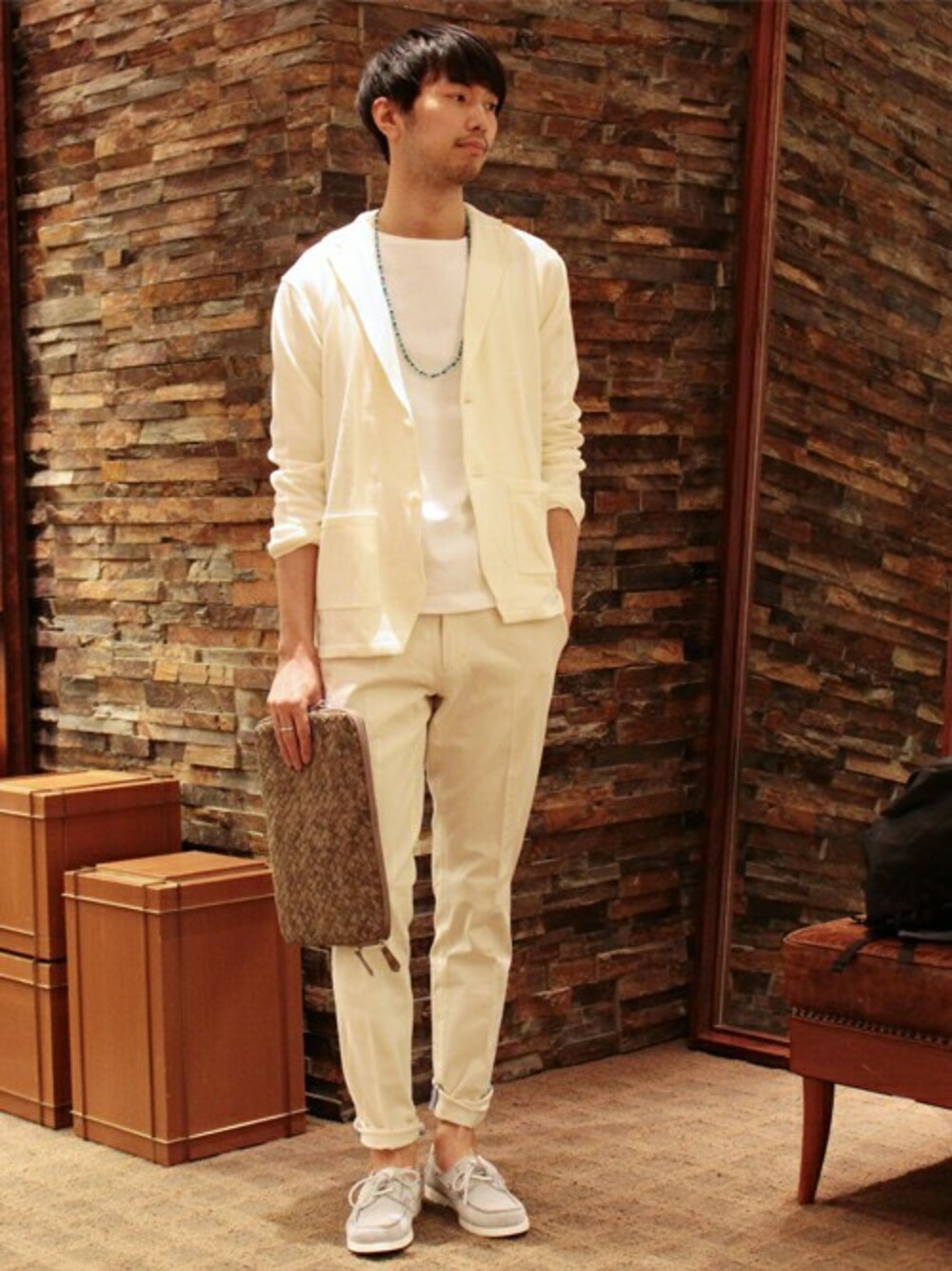 今年らしいオールホワイトのスタイリング。ターコイズカラーのネックレスとカモ柄のクラッチバックがアクセントに。タウンユースからバカンスまで着用頂けます。