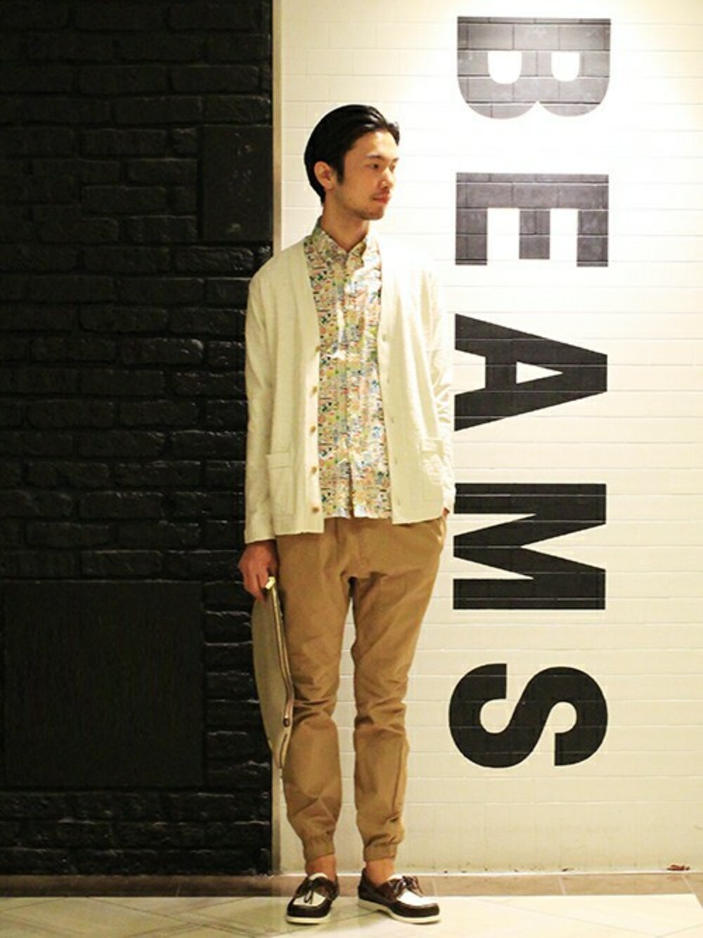 トップスをコットン素材の白のカーディガンにリバティープリントのシャツを合わせることで春夏らしい爽やかな印象のスタイリング。 ボトムに裾がリブになっているチノパンを合わせる事で遊び心をプラスしています。