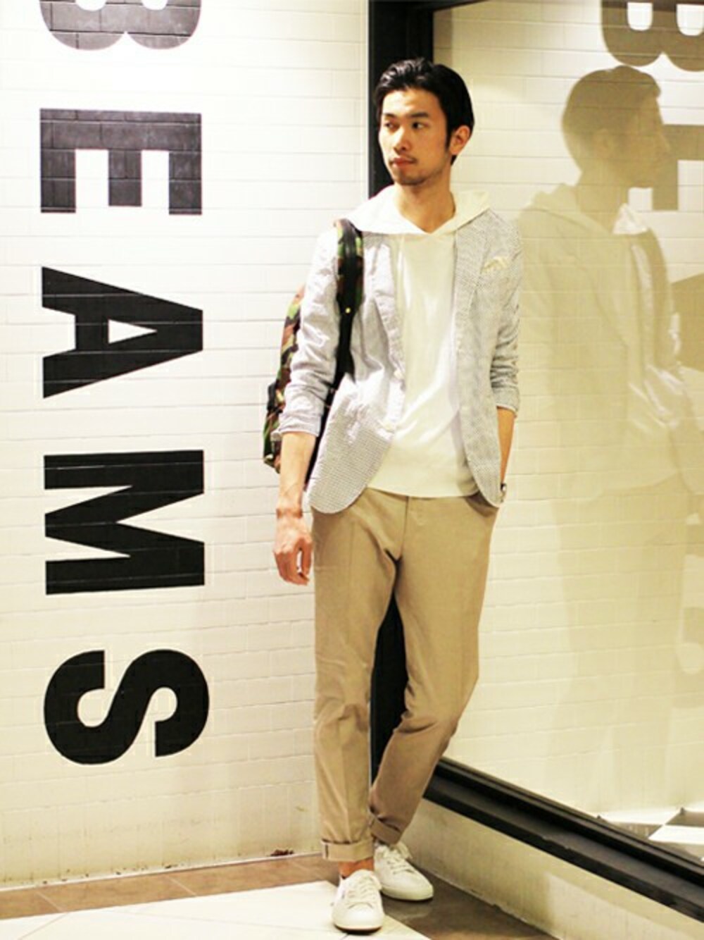 白のパーカーとキャンパススニーカーでカジュアルなスタイリングに、小紋柄のジャケットを羽織ることで引き締まった印象になっています。