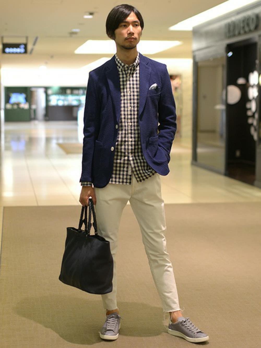 ネイビー×ホワイトの王道的ジャケパンコーディネイト。 パンツをカットオフデニムにして、より軽快な遊びのある着こなしがポイントです。