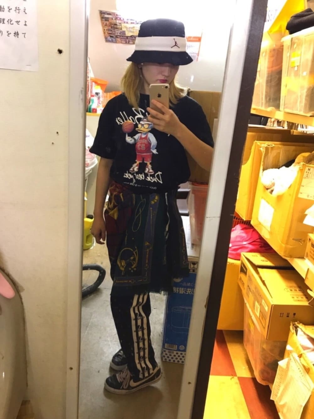 3連勤バイト最終日。今日は動き回るから楽で好きなストリート古着スタイルに👍 ハットは作ったやつで、それにヘアバンドがいい感じにおさまった笑 下半身はほとんどうちの古着屋の👀