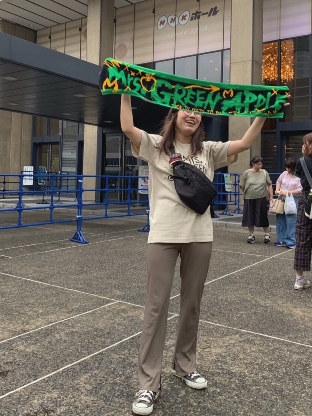 ミセスグリーンアップルのライブコーデ✌️ ベージュのTシャツなので下も合わせました〜 小物は黒でまとめてすっきりと!