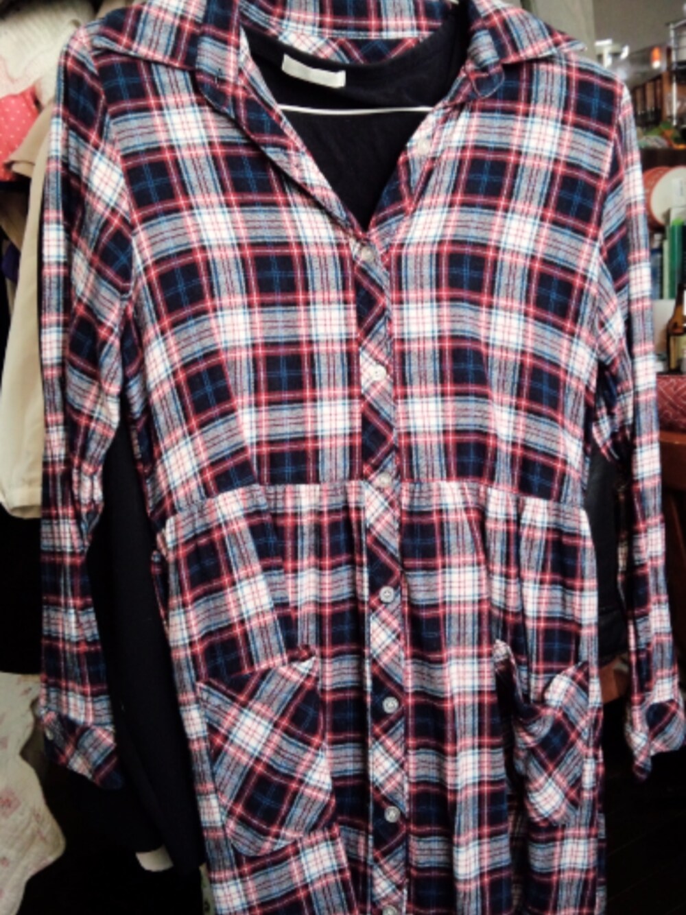 シャツワンピースに黒いインナーで、黒のタイツで履く。 上着はジャケットにするか、カーキのジャンパーにするか、迷ってます